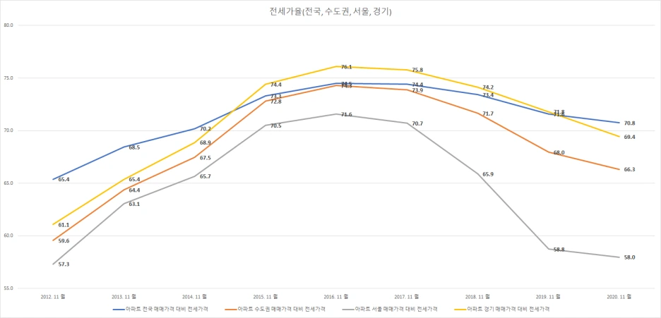 위 자료는 2012년 11월부터 2020년 11월까지의 전세가율이다.