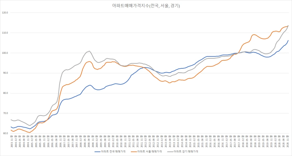 그렇게 따지자면 현재 2017년부터 크게 상승한 서울의 아파트 가격은 아직 더 오를 가능성이 남아있다고 생각한다. 왜냐하면 경기의 아파트 지수가 아직도 서울보다 밑에 있다. 2017년 11월 기준으로 경기는 서울에 비하여 아직도 그 시점보다 많이 오르지 않은 것이다. 그리고 물론 전국 지수는 한참 밑에 있다.