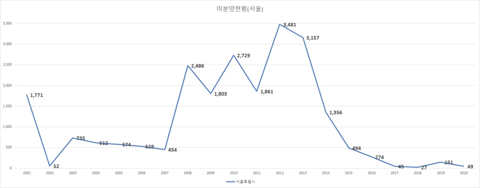 2001년부터 2020년까지의 서울 미분양 주택 현황이다.