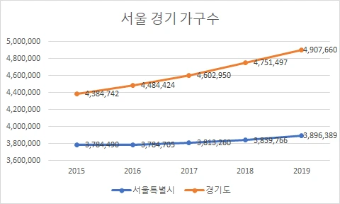 서울은 2015년 378만 가구에서 2019년 389만 가구까지 대략 10만 가구 정도가 늘었으나, 같은 기간 경기는 438만 가구에서 490만 가구로 52만 가구가 늘었다.