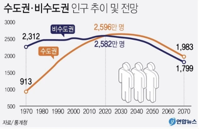 수도권과 비수도권 인구는 2019~20년에 크로스 되어 수도권 인구가 앞질렀으며 앞으로는 심화될 것이다.