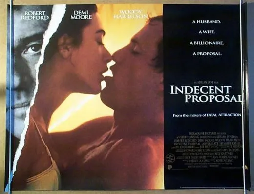 ▼ '은밀한 유혹 (Indecent Proposal, 애드리안 라인 감독, 로버트 레드포드, 데미 무어, 우디 해럴슨 주연 '93년작 미국)'이란 영화의 원제는 '저속한 제안'인데, 이 영화가 인기를 얻고 있을 무렵, TV쇼에서 이 주제로 길거리에 나서, 여성들에게 '당신이라면 어떻게 하겠습니까? 100만 달러 (약 10억원)이면 하룻밤의 사랑을 팔겠습니까?'라고 질문한 적이 있었다.