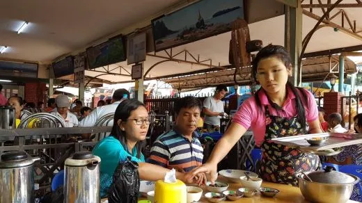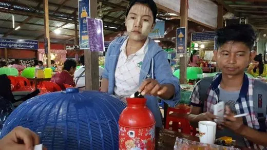 얼굴에 '타나카 (미얀마식 썬블록)'을 바른 직원은 빨간 보온병에 담긴 뜨거운 물을 가져다 준다.