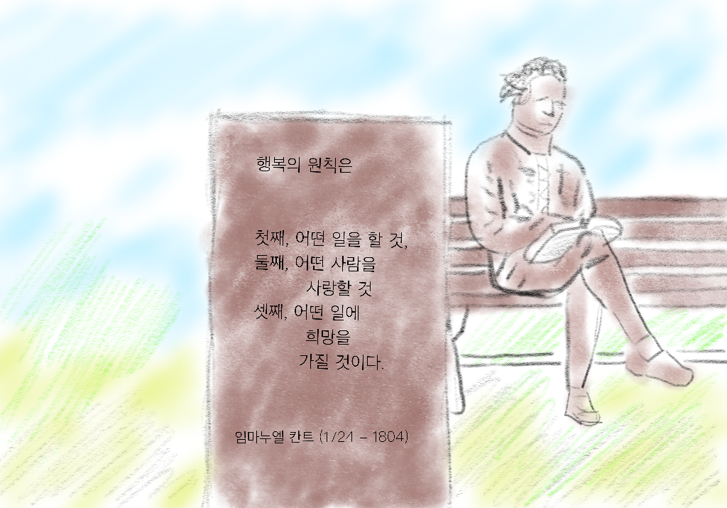 오늘 그리는 그림은, 이 짤막한 몇 줄 안에 담고 싶은 이야기는 그런데, 그런 칸트의 철학이나 좋은 습관에 대한 것이 아니다. 양재천 어느 수변에서 만날 수 있는 규칙과 모범의 상징 칸트의 길에서, 상식과 이성을 벗어난 감성의 대화와 눈빛이 오간 어느 연인의 모습이 조화롭다는 사실이 그저 역동적인 바다 곁 굳건한 바위와 이들의 조화가 어색하지 않음과 비슷한,