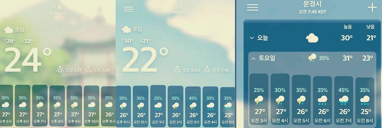 지역별 시간대별 강수확률에 의하면 비 구름이 자정을 기점으로 점차 아래로 내려가고 있었다. 그렇다면, 비에 쫓길 것이 아니라 비를 먼저 보내면 되는 것이 아닐까?라는 생각이 들었다. 심야 시간에 출발하는 것이 이번 여정의 특징이긴 한데, 그것을 버리면 나머지 계획은 지킬 수 있을 것 같았다. 평소보다 이른 아침 시간에 출발하면 오후께 도착해 돌아오는 버스에 무사히 탑승할 수 있을 것이다. 다만 함께하는 이들의 동의가 필요했다. 그렇게 대화방에 썼던 '취소'라는 말을 지우고 다시 썼다.
