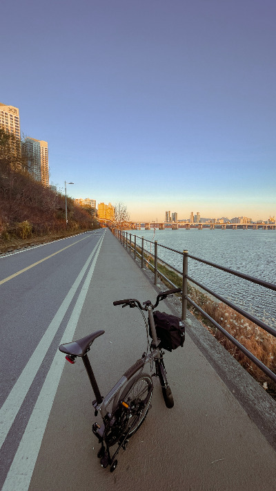 브롬톤과 함께하며, 늘 갈아타야 하는 전철의 환승시간과 집에서 역, 역에서 회사까지 오며 가며 사람들에 치이는 스트레스와 불편함은 일상에서 멀어졌다. 애초에 집이 이사하고 회사와 그 정도 거리가 생기며 자전거는 좋은 대안이 될 것임은 알고 있었다. 적당한 거리란, 너무 가까우면 운동효과가 아쉽고, 너무 멀면 다니기 힘든 그 어중간한 지점이었다. 원래 자전거 타는 것을 좋아했지만, 가지고 있던 로드 자전거는 여러 여건상 출퇴근 탈것으로 적당하지 않았다.