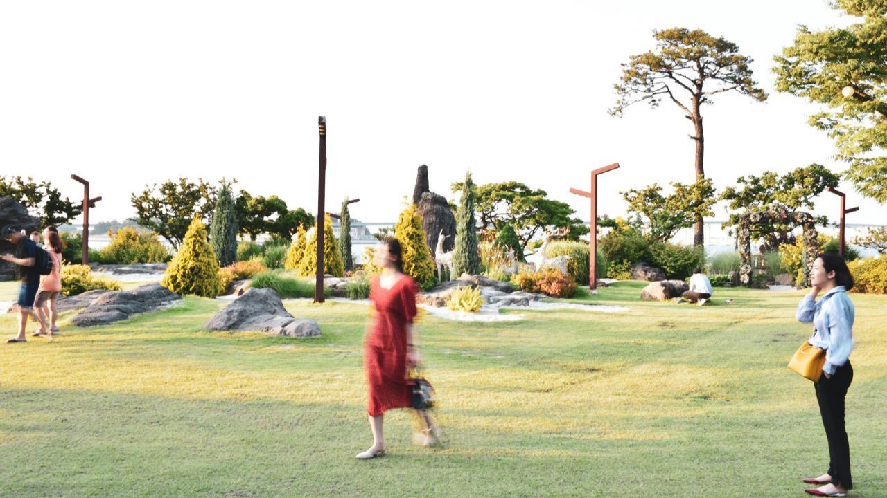 카페 '해어름' 외관을 먼저 둘러본다. 잘 관리되고 있는 인공의 자연 속에서 아이들이 뛰어논다. 간혹 연인들, 또 가족들이 산책을 한다. 고르고 골라 정성껏 키운 관목과 적당한 곳에 배치된 돌들. 무심하지 않은 정교한 배치에 탁 트인 하늘의 상대적 매력을 느껴본다.