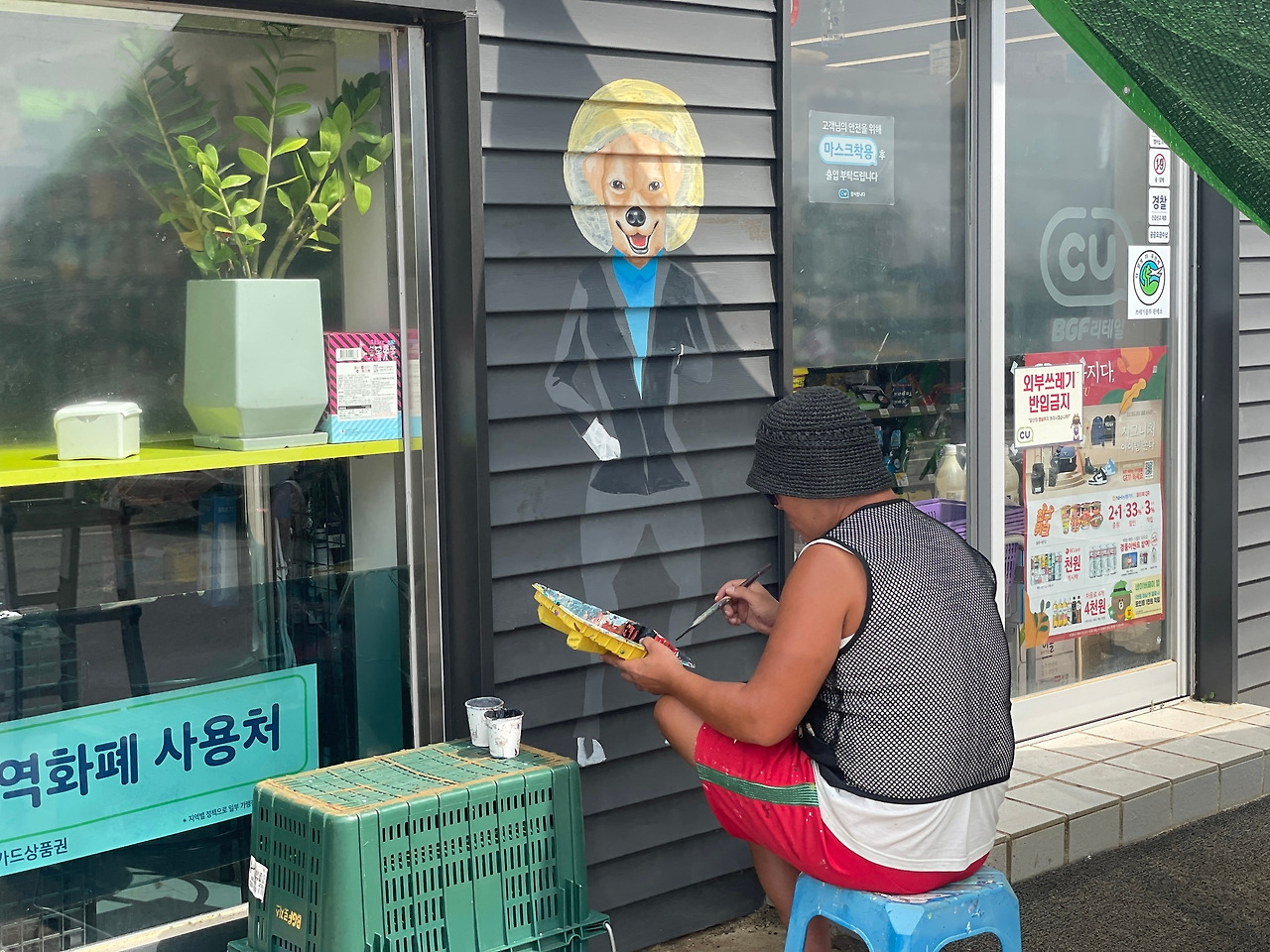 한 시간여를 달려 서귀포시에 접어들었다. 무릉리의 한 편의점 앞에 멈췄다. 보급을 하려 한 것인데 목적은 잊고 잠시 어느 화백의 벽화를 그리는 모습에 시선이 머물렀다. 화가의 실력이었다. 조금 떨어져 서서 붓이 닿는 곳 주위로 시야를 넓혀보니, 이 편의점 벽은 이미 캔버스다. 호랑이, 고양이, 새, 나비, 꽃, 두루미, 달과 산 … 동양화에 자주 등장하는 그림 속 주인공들이 편의점을 두른 벽에 병풍처럼 어우러져 그려져 있었다. 지금 편의점 화백이 그리고 있는 건 양복을 입은 개다. 언젠가 다시 온다면, 완성된 그림을 보러 꼭 다시 들러봐야겠다는 생각을 했다.