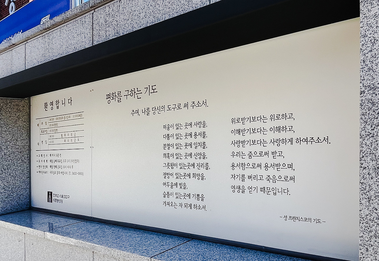 성당 문을 나서며, 입구 오른쪽 벽에 평소 별로 눈여겨보지 않았던 기도문이 그곳에 새겨진 것을 보았습니다.