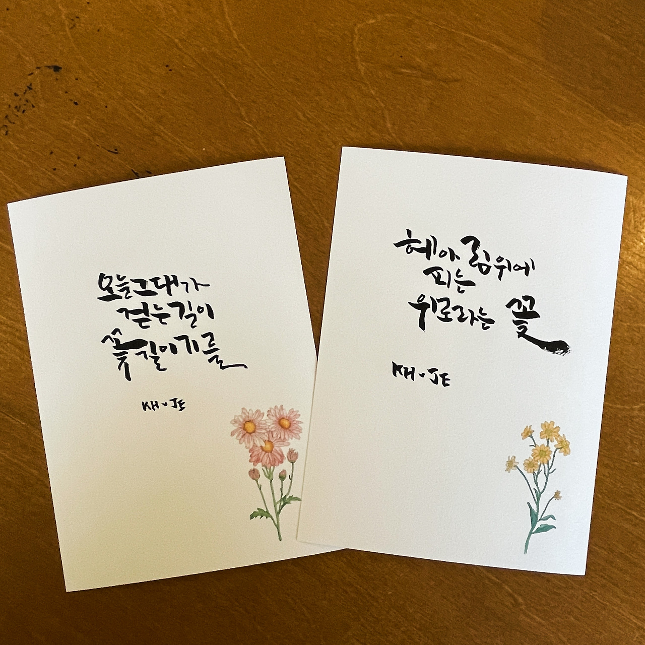 글을 쓰다가 잠시 한숨 돌리려 캘리 붓을 잡았다. 친구 커플을 만나는 날인데, 그들에게 선물할 연하장 정도의 의미로 '꽃'과 어울리는 문구를 찾아봤다. 아직은 꽃을 수채화로 그릴 실력이 안돼 인쇄된 배경지에 최근 연습한 문장을 적어보기로 했다.