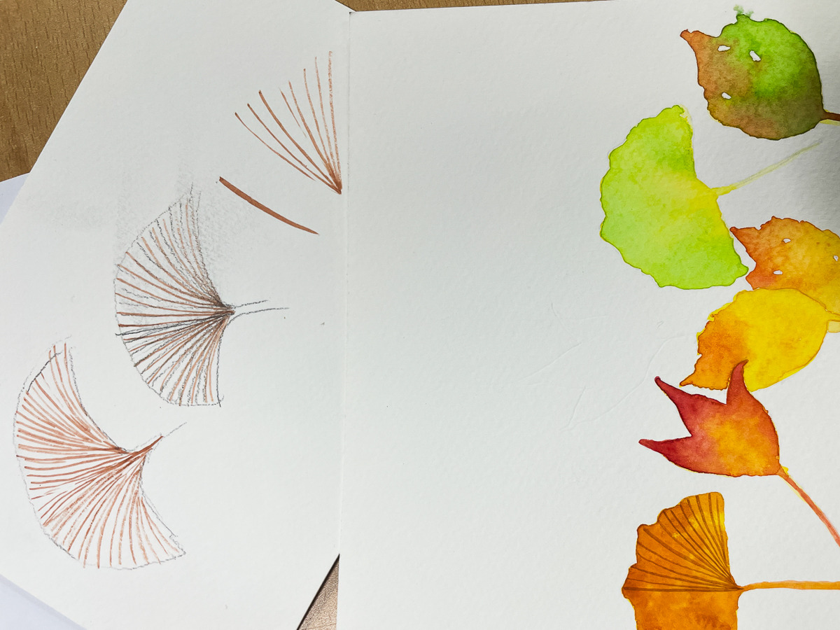 세필로 일정하게 선을 긋는 일이 생각보다 쉽지 않아서, 은행나무 잎을 스케치하고 연습장에 먼저 연습을 했다.