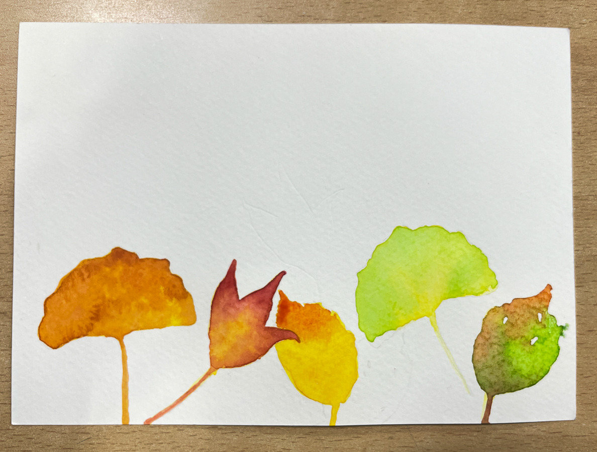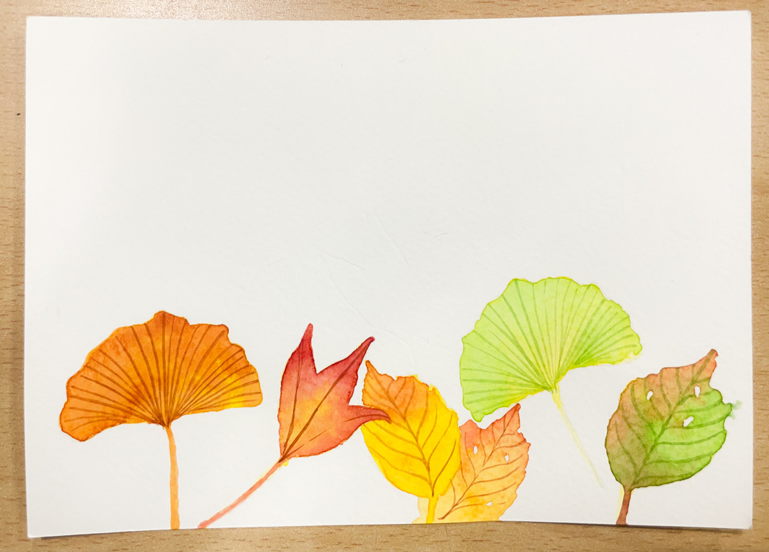 여러 형태의 낙엽 예시 그림을 가지고 각각 적절히 종이 위에 습사를 해 배치한다. 그리고 색을 조합해 칠한다. 처음에는 노란색을 연하게 칠하고, 그 위에 빨간색 혹은 초록 색을 레이어로 포인트를 준다.