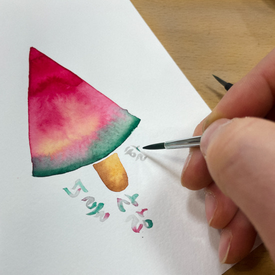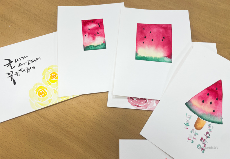 알록달록 예쁜 글자는 물붓을 이용했다. 조금 탁한 물로 먼저 글씨를 쓰고, 그림에 쓰인 색을 글자 선 끝에 조금씩 콕콕 찍어 번지게 하여 그라데이션 효과를 주었다.
