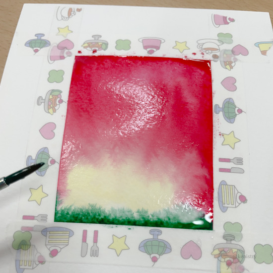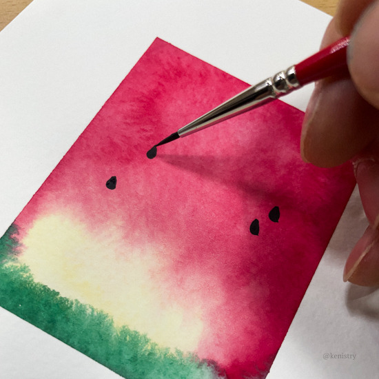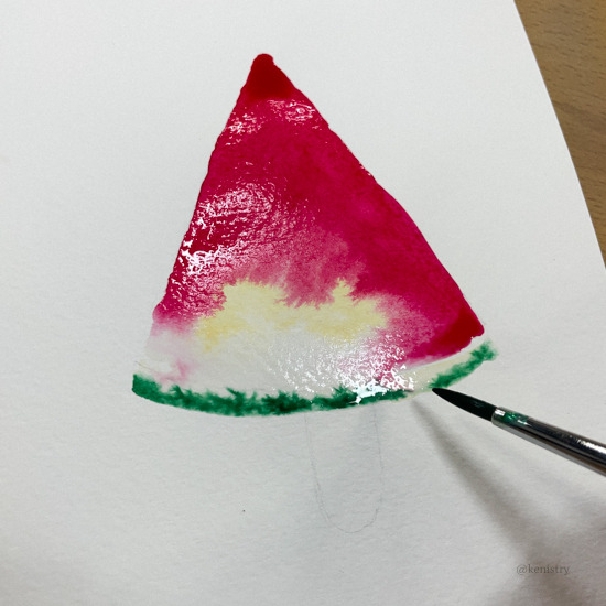마스킹 테이프를 이용하여 경계를 제한하면 칼로 똑바로 자른 듯한 수박을 그릴 수 있다.