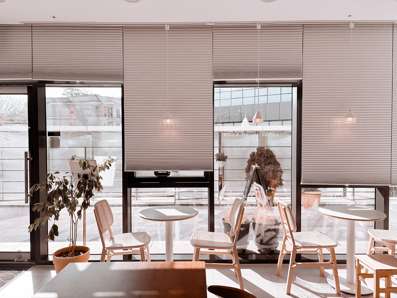 카페가 추구한 공간의 가치를 빛의 온도, 가구의 질감, 소품의 배치만으로 집에서도 구현할 수 있다. 조명은 3000K 정도의 따뜻한 톤으로 낮추어 빛의 결을 부드럽게 만들고, 한지 재질을 연상케 하는 소재의 허니콤 블라인드로 자연광이 잔잔하게 스며들도록 해보자. 가구는 우드나 라탄 소재로 시각적 밀도를 줄이고, 테이블 위 잡다한 물건들을 치우고 대신 무던한 화병을 얹어 시선을 정돈해 볼 수 있다.