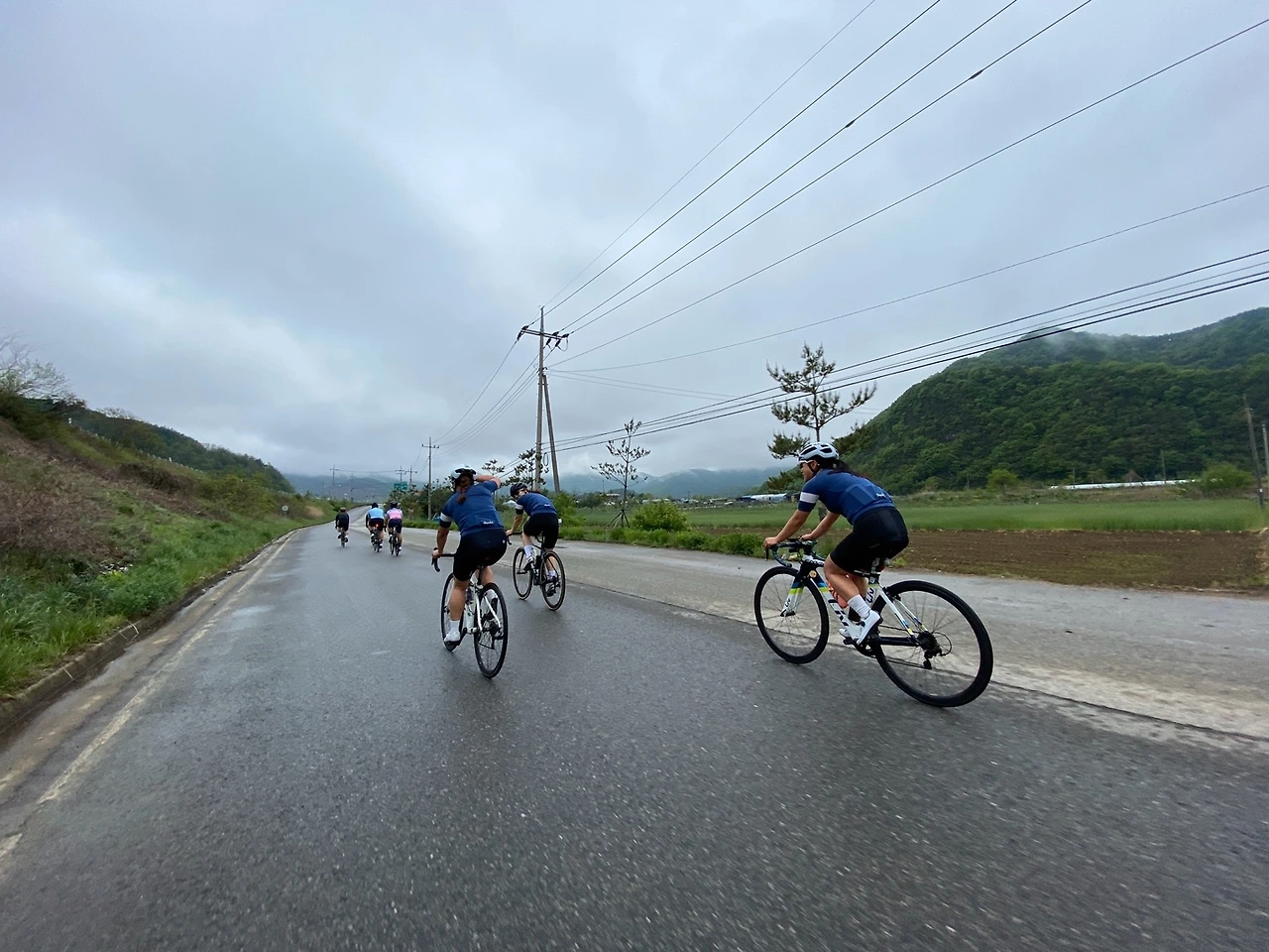하지만 출발을 하게 된 이유는, 잦아드는 빗방울과 더불어 지속적으로 바람이 불어 노면이 빠르게 마르는 상황, 그리고 여기까지 이 많은 사람들이 한 가지 목적을 가지고 모인 시간의 가치 때문이었을까? 약간 으슬한 기온에 움츠림도 잠시, 차도 별로 없는 쾌적한 소백산맥 시골 국도가 이어진 안개 자욱한 미지의 언덕에 이끌려 결국 우리 모두는 출발을 위해 자전거에 올랐다.
