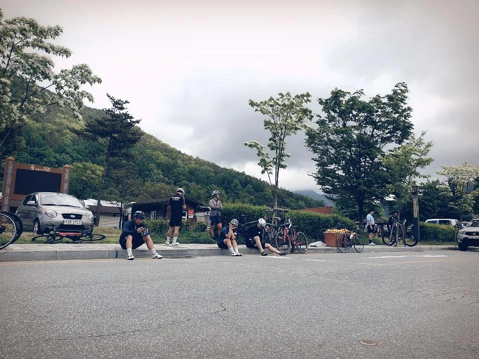 안개가 자욱하다. 산으로 둘러싸인 출발지는 고도가 높아서인지, 아직 쌀쌀한 기온에 가느다란 빗발이 흩날리고 있었다. 시야도 어둡고 바닥도 젖어 바로 출발하지 않고 조금 더 버스에서 상황을 지켜보기로 했다. 일부는 이미, 위험할지 모를 빗길 라이딩을 포기했다. 약 30분을 기다리자 다행히 비는 잦아들었다. 하지만 노면이 아직 젖어있어 우려의 목소리도 많이 들렸다. 자전거는 그 특성상 젖은 노면에 매우 취약하고, 특히 굽이길이 많은 산악지형 내리막에선 더 위험하다. 여럿의 라이딩을 주최하는 주최자 입장에선 안전이 가장 신경 쓰인다.
