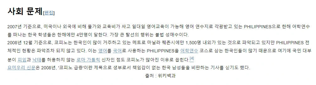 1. 『요미우리 신문은 2008년, '코피노 급증'이란 제목으로 생부로서 책임감이 없는 한국 남성들을 비판하는 기사를 싣기도 했다. 』