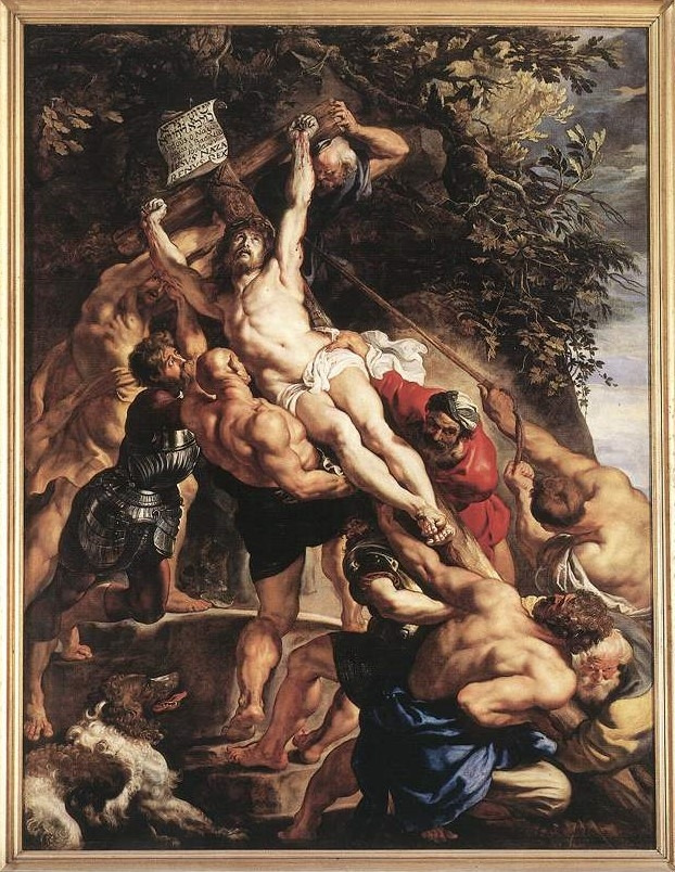 그중 <그리스도의 십자가를 세움>[그림 1]은 루벤스가 북부의 세밀화 전통과 이탈리아 고전주의를 어떻게 통합시켰는지를 잘 보여준다. 십자가를 들어 올리는 울퉁불퉁한 근육질의 남자들은 미켈란젤로의 인체를 연상시키며, 십자가의 세부와 몇몇 구성은 틴토레토의 <십자가에 못 박힌 그리스도>를 떠올리게 하고, 빛과 색채는 베네치아 회화의 영향을 느끼게 한다. 한편 군인이 입고 있는 갑옷과 그림 왼쪽 하단에 그려진 강아지의 곱슬곱슬한 털의 세밀한 묘사는 알프스 북부의 것이다. 루벤스는 거기에 대각선 구성과 격정적인 동작, 강한 명암 대비와 피부 표면에서 일렁이는 빛의 움직임 등 자신만의 고유한 특징을 더했다.
