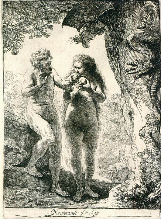 그림 1. <자화상>, 1629, 캔버스에 유화, 38 x 29 cm / 그림 2. <아담과 이브>, 1638, 에칭, 162 x 116 cm