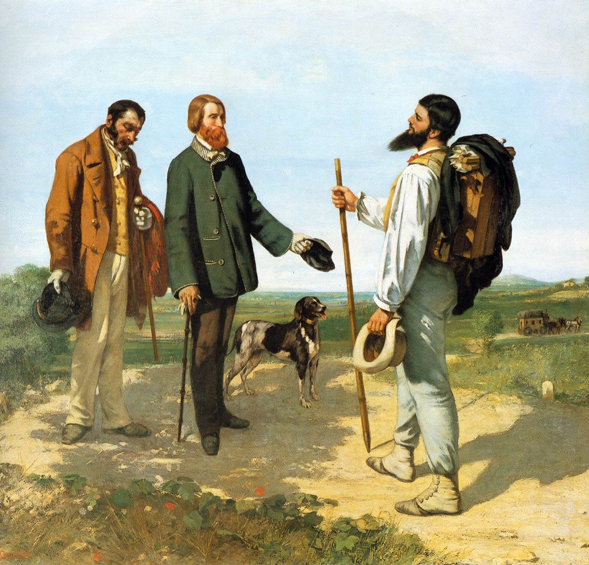 <안녕하십니까, 쿠르베 씨>[그림 2]는 이 화가의 특징을 단적으로 보여준다. 언덕 위에서 산책을 나온 세 남자가 만나고 있다. 번듯한 옷을 차려입은 후원자들(왼쪽 두 사람)이 모자를 벗고 공손히 인사를 하는데, 화구를 짊어 맨 쿠르베가 턱을 들고 인사를 받는다. 후원자들이 타고 온 마차는 매우 작게 그려져 있다. 언듯보면 미니어저인지 멀리 있어 작게 보이는 것인지 불분명하다. 이 그림은 사람들을 불편하게 만들었다.