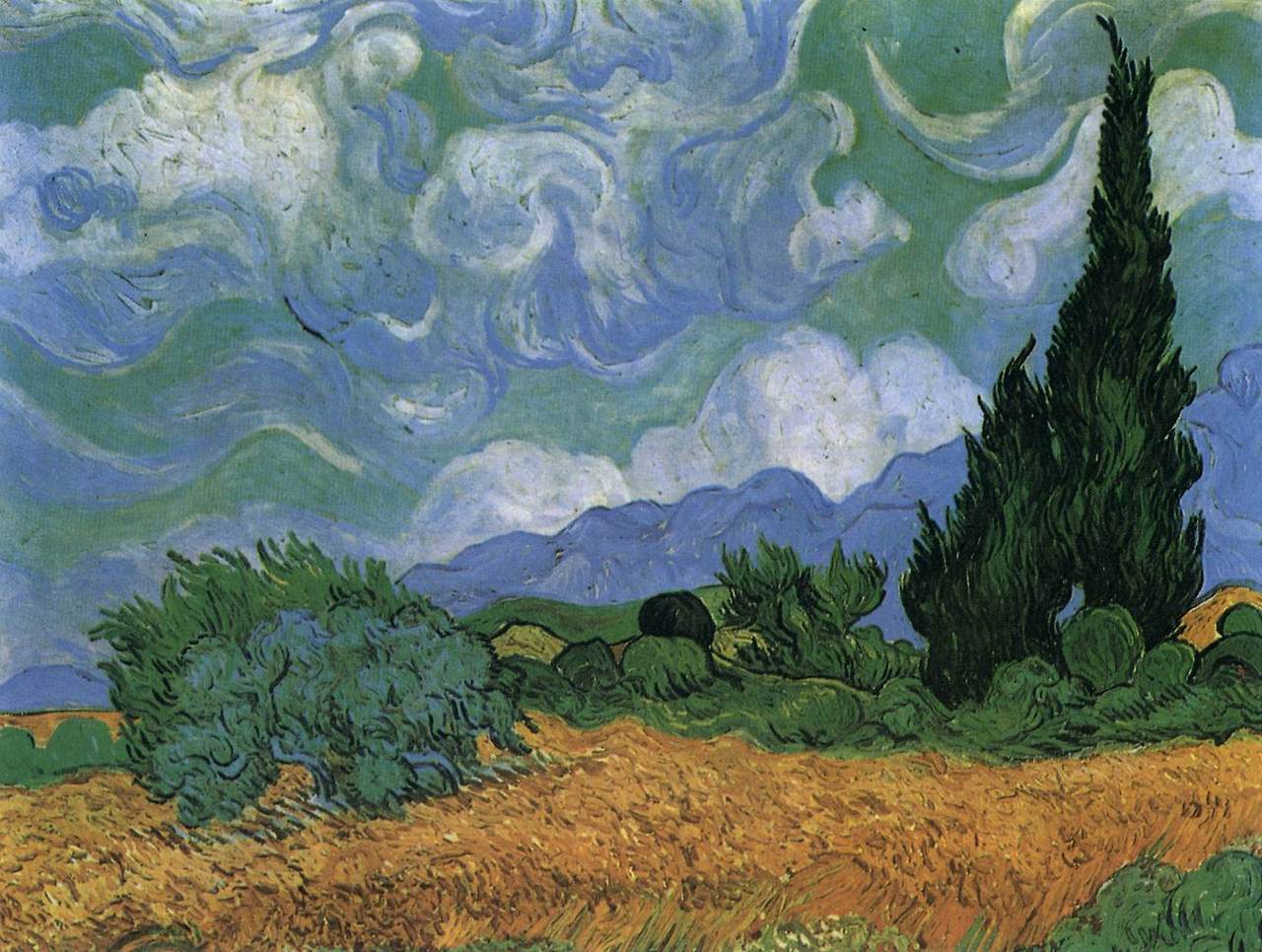 고갱이 떠나고 아를의 한 병원에서 치료를 마친 고흐는 이후 반복적인 환각에 시달리다 스스로 생 레미 요양원에 자진해서 입원을 한다. 그곳에서도 고흐의 붓은 멈추지 않았다. 그는 가끔씩 발작에 시달렸지만 그림을 그리는 일이 최선의 치료책이라고 생각하여 정신이 온전할 때면 언제나 붓을 들었다. 생 레미에서 <별이 빛나는 밤>[그림 5], <사이프러스 나무가 있는 밀밭>[그림 6]을 그리며 고흐의 필선은 더욱 대담해지고 색채는 더욱 강렬해졌다.