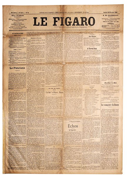 1909년 파리의 <르 피가로>지에는 매우 도발적인 <미래주의 선언>이 발표되었다. [그림 1] 욕설과 기괴한 일화로 시작되는 이 선언문의 작성자는 시인이자 극작가로 활동했던 필리포 마리네티(Filippo Tommaso Marinetti, 1876–1944)였다. 그는 교통사고를 깨달음의 순간으로 묘사하고, 공장의 배수구와 구정물을 신처럼 찬미했다. 그 글은 낡은 현실을 분개하는 외침이자 정치적인 선동이었다.