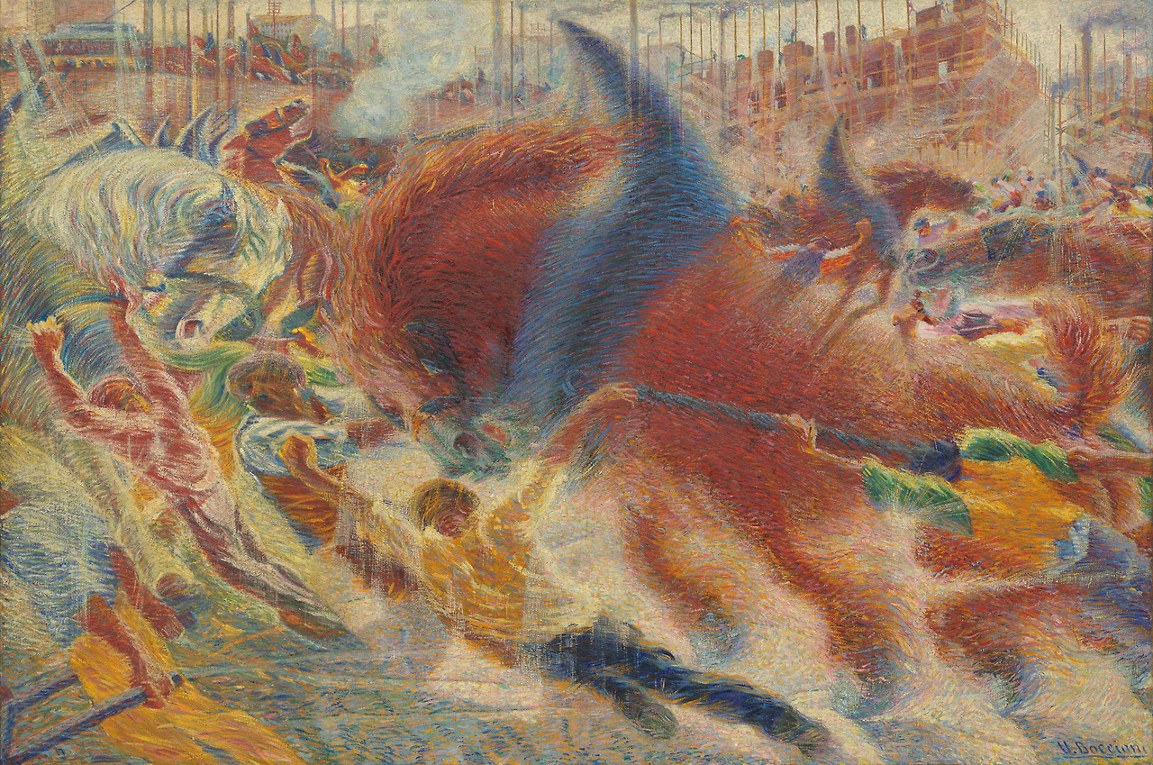 미래주의 화가들의 포부는 거창했다. 그들은 우주의 역동성 그 자체를 담아내고, 미친 듯한 속도와 빠른 진동처럼 변화하는 형태를 구현하겠다고 선언했다. 하지만 그들에게 큰 모순이 자리하고 있었다. 첫째, 이들은 이탈리아 민족주의를 지향했지만 유럽 내에서 국제적으로 인정받기를 바랐다. 마리네티가 <미래주의 선언>을 이탈리아가 아닌 파리에서 발표한 것은 미래주의가 유럽 전역에 퍼져나가길 원했기 때문이다. 그러나 다른 한편으로 그는 외국의 간섭을 원치 않는 민족주의를 지지했다. 둘째, 미래주의는 과거에 파리에서 시작된 신인상주의와 입체주의 등을 절충하는 방식으로 자신들의 예술 형식을 만들어갔다. 말은 미래를 지향했으나 형식은 과거에서 빌려 온 것이다. 이런 모순 속에서 탄생한 것이 보치오니의 <일어나는 도시>[그림 2]다.