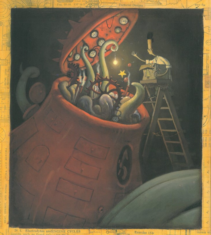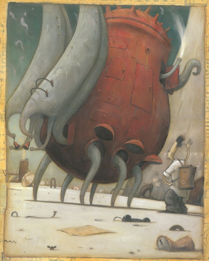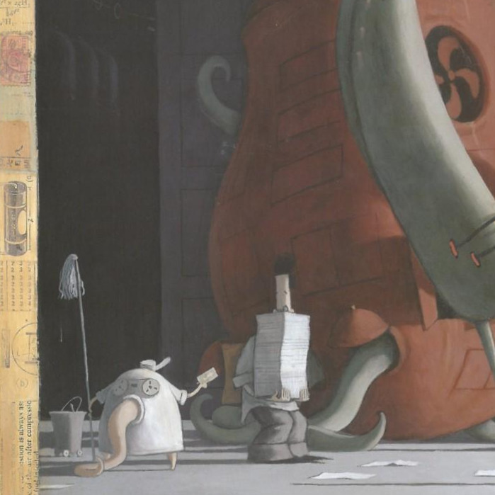 ‘버려진 것’의 형상 역시 콜라주처럼 이상한 것들의 조합으로 만들어졌다. 붉은 용광로 같은 몸통과 집게발, 작은 종과 반짝이는 노란 별까지. 생명체인지 로봇인지 알 수 없는 그 형상은 자연과 문명에서 이중으로 버려진 것들로 만들어 낸 멋진 콜라주다. 그런데 그것의 몸 안에는 우리가 버렸고 세상에서도 지워졌지만 여전히 반짝이는 소중한 것들이 담겨있을 것만 같다.