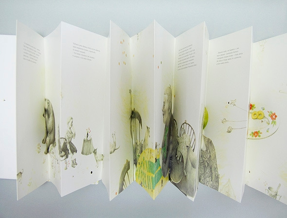 예를 들어 왕자와 칵투시아는 서로 다른 페이지에서 등장하는데 접힌 종이를 펼치면 둘이 한 의자에 같이 앉아있는 것이 보인다. 우울한 왕자는 자기 세계에 빠져있고 칵투시아는 그런 왕자와 상관없는 것처럼 앉아 있었는데 실은 둘은 곁에 있었다. 아코디언 북의 장면들은 이렇게 좌우를 펼쳐보기 전까지 알 수가 없다.