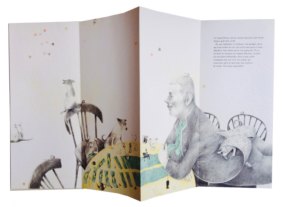 그런 강아지들을 보면서 왕자는 딱 한 번 웃음 짓는다. 그 장면은 사실 일반적인 책처럼 대면을 넘겨 볼 땐 강아지들끼리 노는 장면과 왕자가 있는 장면이 나뉘어 있다. 그런데 접힌 종이를 펼치면 두 장면이 하나로 연결된다. 이렇게 앞뒤로 접힌 종이를 하나로 이어서 만들어진 책을 아코디언 북이라고 한다. 그림 작가는 아코디언 북으로 책을 구성하면서 펼쳐보면 이야기가 달라지는 그림책을 구성했다.