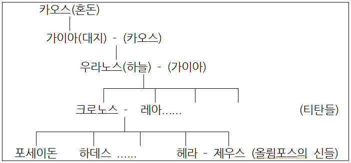 히브리 사람들의 창조신화와 비교해 보면 그리스신화의 특징이 더 분명하게 나타난다. 창세기에서 세상은 태초에 신의 말씀에 따라 창조된다. 신의 선한 의도로 하루하루 새롭게 생겨난 세상은 질서 잡힌 아름다운 곳이다. 그리스인들은 이와는 반대로 세상의 창조과정을 무시무시한 대립과 투쟁의 과정으로 이해했다.