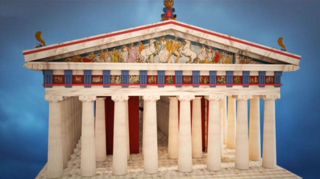 그리스 미술가들의 가장 중요한 과제는 신전 건축과 신상 제작이었다. 우리가 아는 백색의 그리스는 고대에 없었다. 지중해의 밝은 태양 아래서 그리스 신전들은 화려한 원색으로 빛났다. 그리스 신전은 기독교 교회와 달리 신도들이 모이는 예배 공간이 아니었다. 제전과 축제는 신전 앞 광장에서 이루어졌고, 신전은 말 그대로 ‘신의 집’으로 신상을 모시는 성소였다.