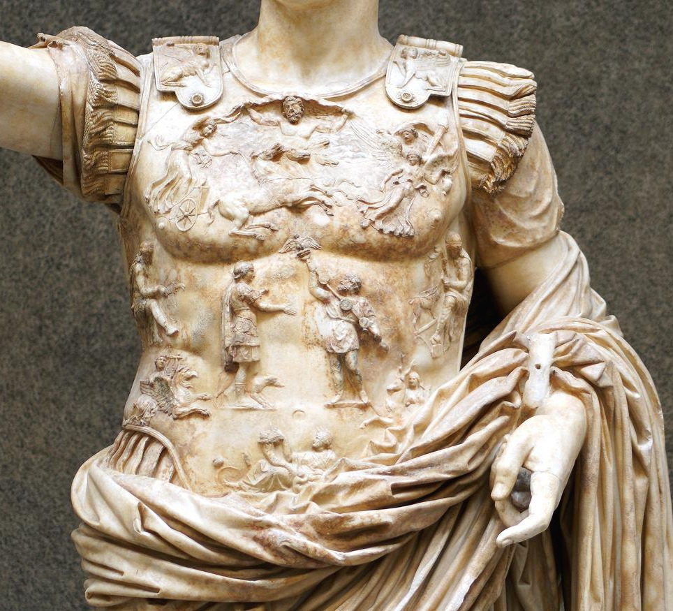 상징적으로 표현된 신성과 달리 로마 군대의 위엄은 보다 직접적으로 묘사되었다. 황제의 복부에 새겨진 두 인물은 로마 병사와 파르티아인이다.[그림 3] 이는 로마가 기원전 20년에 파르티아에게 승리한 것을 기념하는 형상이다. 파르티아인은 군기를 로마 군인에게 바치고 있는데 제구가 작고 볼품없는 옷을 입고 있다. 그와는 대조적으로 군복을 입고 어깨에 토가를 걸치고 있는 로마 군인은 키가 크고 당당하다.