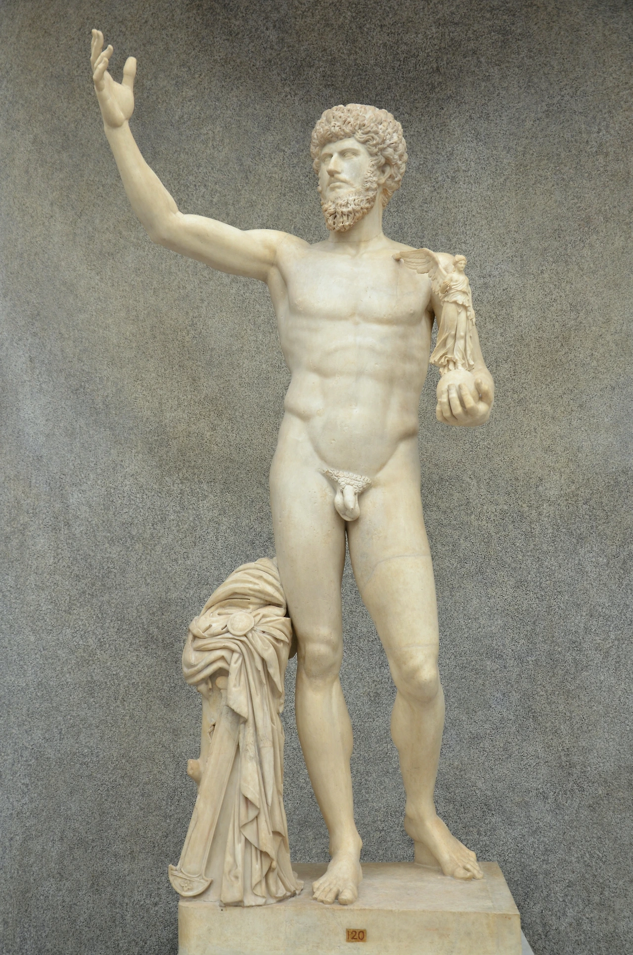 후대의 황제들은 이를 많이 모방했다. 기원전 440년경에 만들어진 <루키우스 베루스 황제의 조각상>[그림 5]은 왼손으로 승리의 여신상을 들고 있는 것을 제외하면 <아우구스투스 상>과 포즈가 거의 유사하다. 조각가는 구불구불한 수염 등으로 황제의 개성을 나타내면서 오른손을 들고 있는 포즈로 장엄한 분위기를 연출했다.