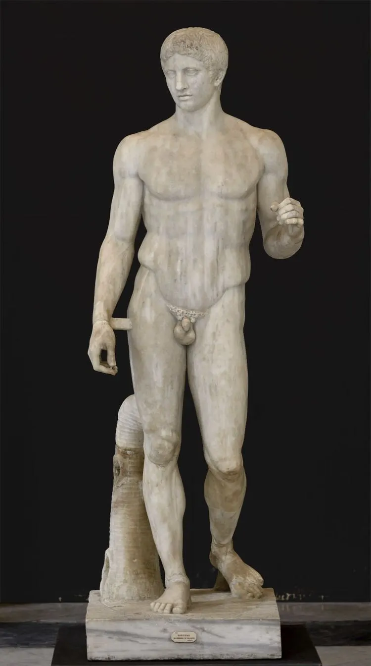 <도리포스-창을 든 남자>[그림4]는 기원전 5세기 그리스 작품을 모사한 조각이다. 나란히 놓고 보면 <아우구스투스 상>[그림2]은 이 조각과 상당히 유사하다. 머리 모양과 얼굴 생김새, 약간 오른쪽으로 돌아간 고개와 오른발에 무게를 싣고 왼 다리를 살짝 뒤로한 자세까지 똑같다. 두 조각은 모두 왼손에 창을 들고 있었을 것이다. 하지만 결정적인 차이가 있다. 앞으로 뻗고 있는 아우구스투스의 오른팔이그것이다. 이로 인해 조각의 분위기가 크게 바뀌면서 <아우구스투스 상>은 우아하고 건장한 운동선수가 아닌 통치자의 면모를 지니게 된다.