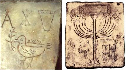 기독교인들은 가까운 사람들의 죽음을 지켜보며 영원한 삶을 갈망하는 기도를 올렸고, 그 마음을 벽에 새겼다. 나뭇잎을 물고 있는 새[그림 2]는 대홍수 때 노아에게 올리브 잎 물고 온 비둘기로, 구원과 성령의 표상이었다. 어린 양은 고통을 짊어진 희생양 그리스도를 상징했고, 메노라(일곱 개의 가지를 가진 촛대)[그림 3]는 하느님의 등불이자 신의 눈을 의미했다.