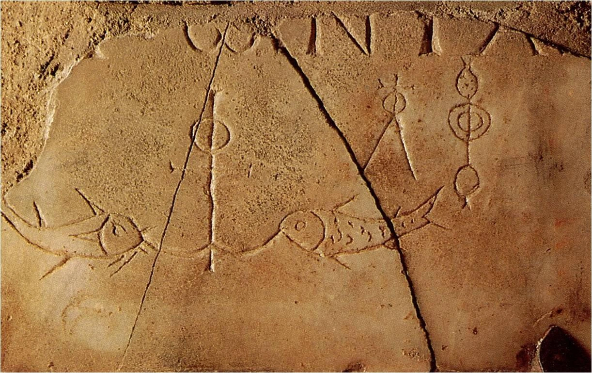 카타콤바의 도상 중에 우리 눈에 조금 낯선 것은 닻이다.[그림 5] 닻은 바다를 떠돌던 배가 안전하게 항구에 정박했다는 의미로 신이 인간을 구원하여 천국에 이르게 해줄 것이라는 소망의 표현이다. 상징이란 이렇듯 상징체계를 모르면 그 맥락을 읽기 어렵다. 물고기 도상도 그중 하나다.