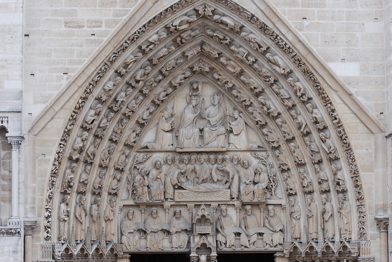 그리하여 한 번도 교회에서 공인된 적이 없었던 성모에 관한 신화가 만들어졌다. 성모가 죽은 뒤 그 영혼과 육체가 손상되지 않고 하늘에 올라 예수로부터 천상의 관을 수여받는다는 스토리가 부각되었다. 거기에 성모 마리아의 부모인 안나와 요아킴이 예루살렘 성문 앞에서 재회하는 입맞춤만으로 딸을 잉태했다는 이야기도 덧붙여졌다. 많은 노트르담 대성당의 전면 팀파늄에는 이 같은 이야기가 부조로 새겨져 있었다.[그림 2] 이는 숲이 파괴되고, 급격한 도시화가 이루어지는 과정에서 마음이 공허해진 이들을 흡수하기 위한 교회의 전략이자 배려였다.