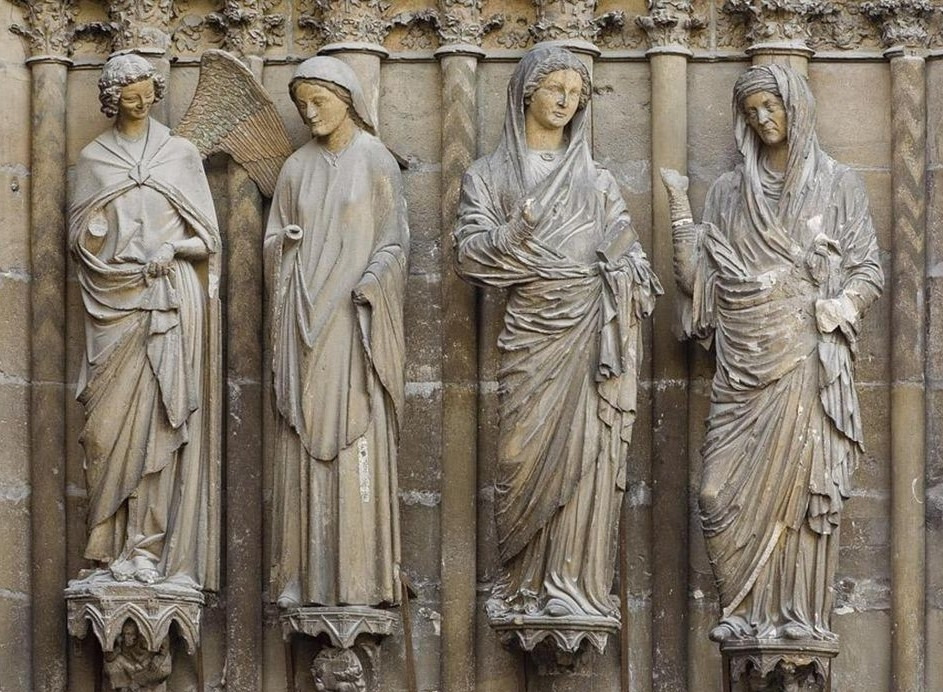 오른쪽 조각의 주제는 <성모의 방문>이다. 예수를 잉태한 마리아가 세례자 요한의 어머니 엘리사벳을 찾아가는 장면이다. 이미 아이를 나이가 지났으나 하느님의 은총으로 아이를 갖게 된 엘리사벳에게 마리아가 찾아오자 엘리사벳의 뱃속의 아기가 기쁨으로 뛰놀았다고 성서는 전하고 있다. 고딕 성당은 이렇듯 다른 시간에 벌어진 사건을 아무렇지도 않게 한 공간에 병치시킨다.