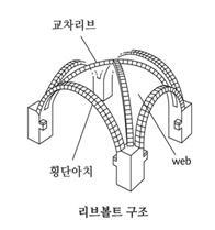 이런 높이를 가능하게 한 기술은 첨두아치(뽀족한 아치)[그림 4]였다. 활모양의 늑재를 교차시켜 만든 첨두아치(교차리브)는 원형아치보다 더 높은 천정을 가능하게 했다. 고딕 건축가들은 여기에 몇 가지 기술을 더했다. 건물 구조를 단단하게 지탱해 줄 부벽(扶壁, buttress)과 천정의 무게를 외부로 분산시킨 공중부벽이 그것이었다. 이 두 가지 구조물 덕분에 고딕 성당은 두꺼운 벽 없이도 높이를 유지할 수 있었고, 벽면을 대신해 화려한 스테인드글라스가 채워질 수 있었다.