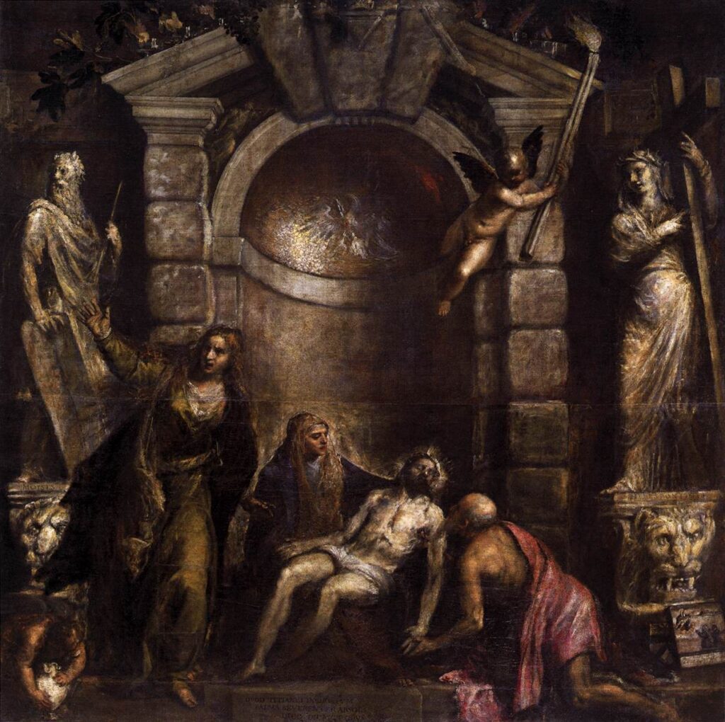 <피에타>[그림6]는 티치아노가 죽던 해에 자신의 무덤을 장식하기 위해 그린 그림이다. 늙은 성 제롬은 공손하게 무릎을 꿇고 죽은 예수의 몸을 어루만진다. 티치아노는 이 겸손한 성인의 얼굴의 자신을 얼굴을 그려 넣었다. 충동적으로 한 손을 들고 한 발을 내딛는 막달라 마리아와 횃불을 들고 날아오르는 아기 천사가 화면에 활기를 불어 넣어주고 있지만 전체적인 색조는 음울하다.