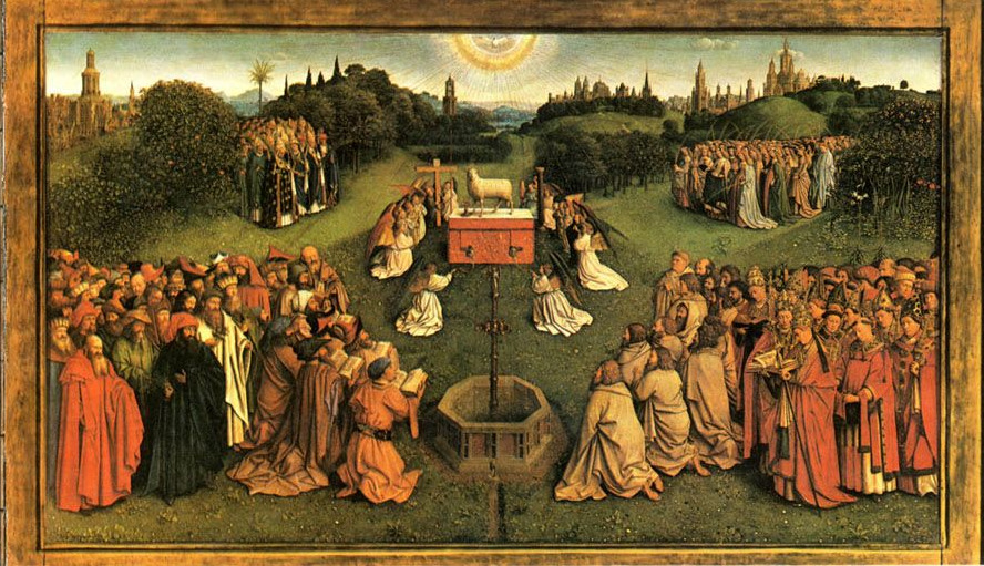 <헨트 제단화>를 펼치면 무채색으로 그려진 닫힌 면과는 대조적으로 화려한 색조의 그림을 볼 수 있다. 펼친 면[그림3]의 하단 중앙 패널에 자리 잡은 그림은 <어린 양에 대한 경배>[그림 4]이다. 이 그림의 중앙에는 예수를 상징하는 희생양이 제대 위에서 피를 흘리고 있고, 그 위로 비둘기 모양의 성령이 내려온다. 이 두 가지 상징이 위쪽 패널에 그려진 성부의 모습과 수직으로 이어지면 삼위일체가 완성 된다.