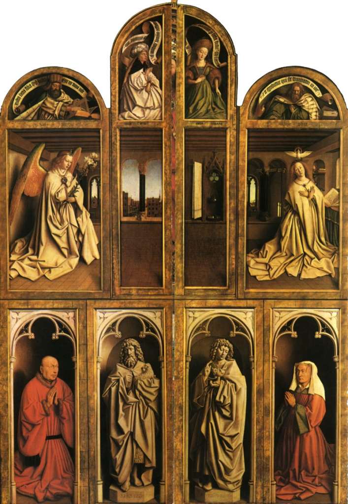제단화는 평소엔 접어두다가 특별한 날이 되면 제대 앞에 펼쳐 두는 그림이다. 닫힌 상태의 <헨트 제단화>는 크게 세 부분으로 나뉘는 데 제일 윗부분에는 예수의 탄생을 예고한 구약의 예언자와 이교도 무녀가 있고, 가운데 부분에는 수태고지가 그려졌다. 제단화의 아랫부분에는 헨트 시의 수호성인인 세례자 요한과 사도 요한이 각각 어린 양과 잔을 든 모습으로 조각처럼 묘사되었다. 성인들의 좌우에는 이 그림의 의뢰자인 요스 베이트와 그의 아내가 경건한 자세로 기도를 올리고 있다.