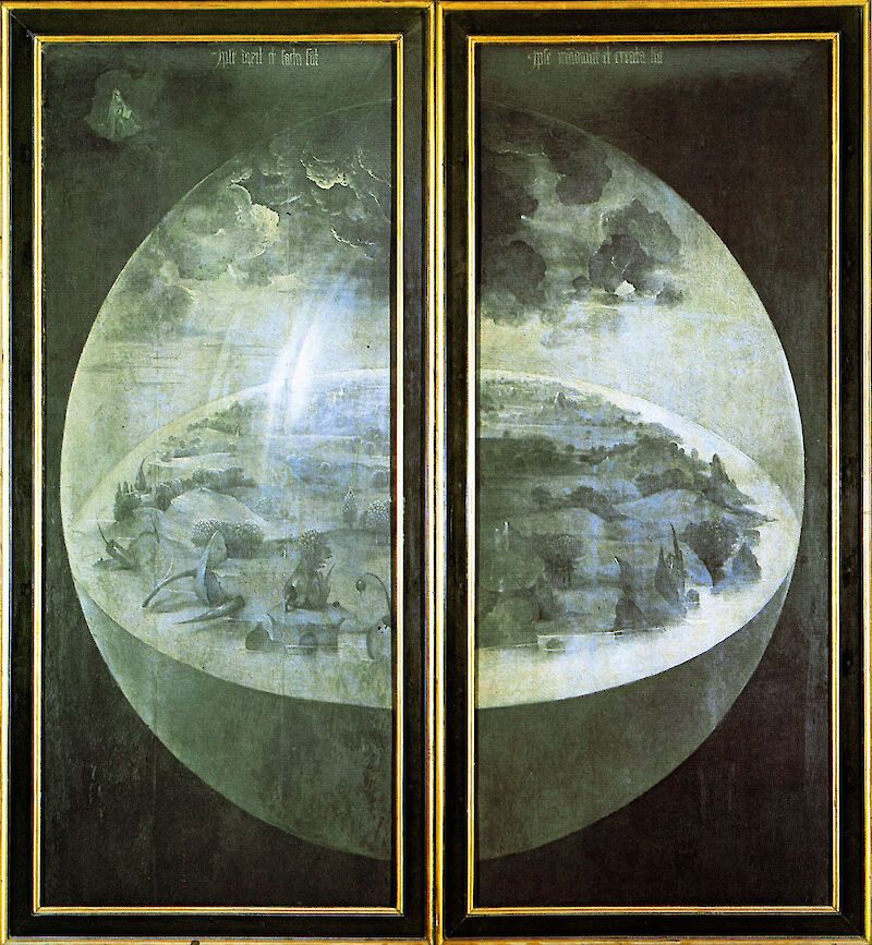 이 작품은 단색으로 그려진 태초의 창조 장면으로부터 시작된다.[그림1] 거대한 구형의 세계가 이제 막 창조되었다. 왼쪽 상단 구름 사이에서 신은 자신이 만든 세상을 축복하고 있고, 두 패널의 상단에는 성서의 문구가 쓰여있다. “그가 말씀하시자 이루어졌으며 명하시자 견고히 섰도다.”(시편 33:9) 의미심장해 보이는 구름이 꿈틀대고 있지만 회색빛 세상엔 아직까지 적막만이 감돌고 있다.