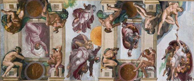 이 그림은 시스티나 성당 벽면을 장식하는 다른 벽화들은 물론이고, 미켈란젤로 자신이 그린 천장화 <천지창조>[그림2]와도 어울리지 않는다. 원근법은 무너지고 인물들의 크기는 제멋대로다. 예를 들어 관람자로부터 멀리 떨어져 있는 예수가 가장 크게 그려졌다. 덕분에 예수는 더욱 거대하고 강력해 보인다. 하지만 그만큼 공간은 더 비합리적으로 보인다.
