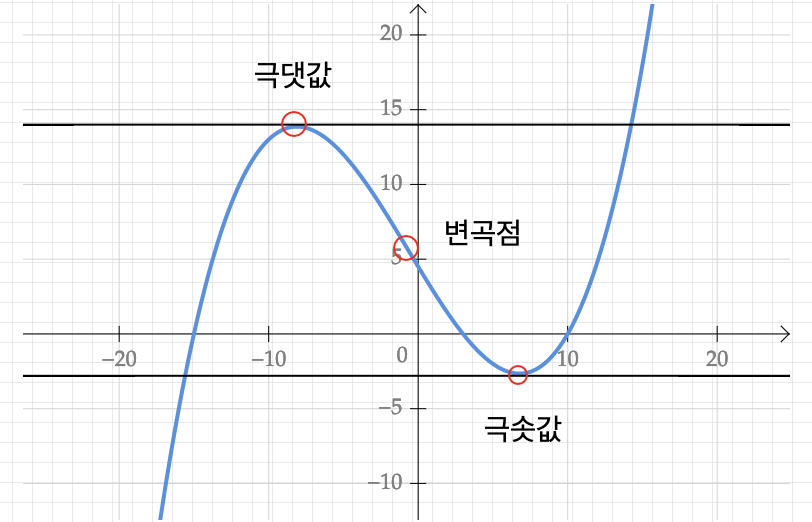 그래프의 특징적인 부분의 용어를 이야기하면 x절편, y절편, 극값, 변곡점 등을 알고 있어야 합니다.