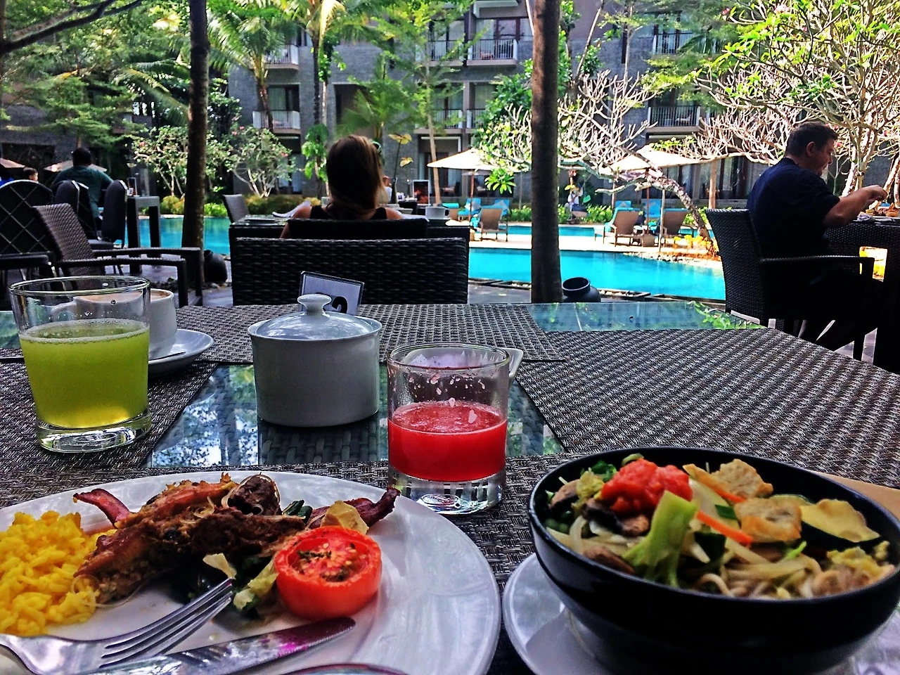 게으른 우리의 아침을 깨우는 힘은 식탐이었다. 리조트에서 제공되는 조식은 인도네시안 음식부터 서양식까지 그 종류가 무궁무진했다. 토스트에 에그 스크램블 따위는 의미 없다! 내가 탄수화물 중독자다운 자세로 온갖 면과 밥 종류를 섭렵하는 동안 신랑은 빵과 고기로 접시를 가득 채웠다. 과일 주스는 또 왜 그렇게 맛있는 건데.