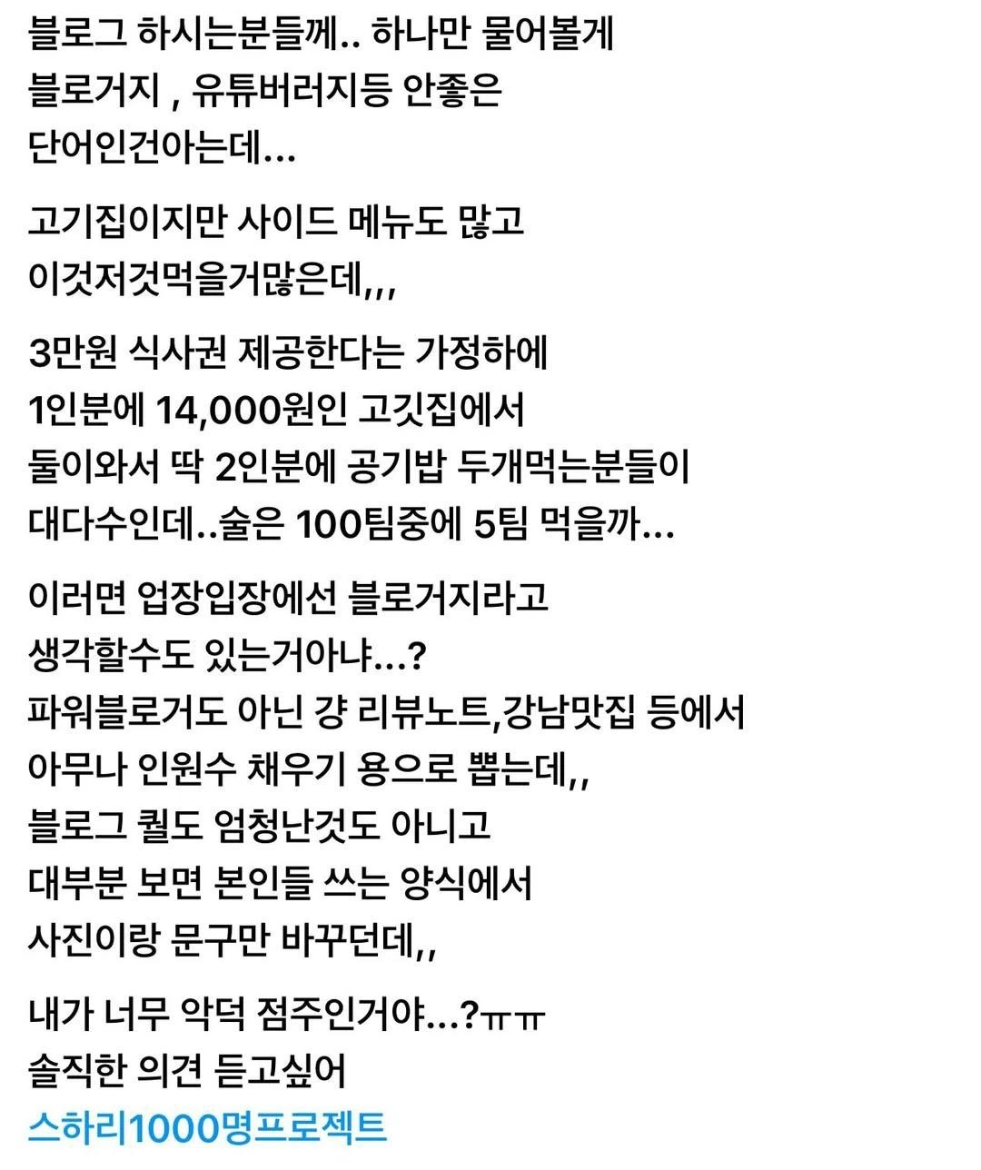 체험단을 다니며 사장님들이 블로거를 블로거지로 취급하는 곳을 많이 목격했었다. 가게를 홍보해 달라고 체험단 사이트에 모객을 하고서는 마케팅에 도움을 주는 인플루언서를 음식 구걸하러 와서 공짜밥을 베풀어야 하는 거지처럼 대한다.