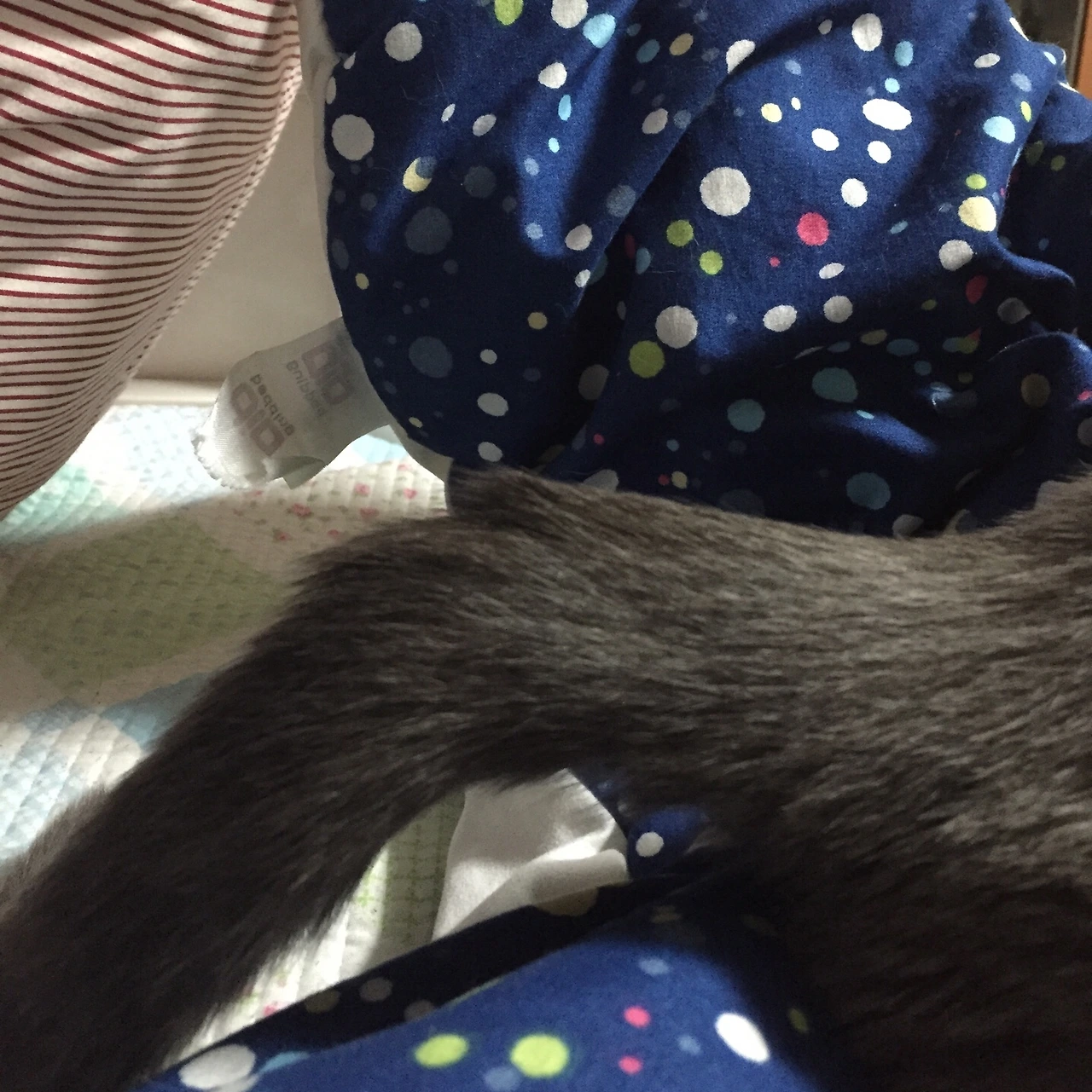 반갑다고 침대 위로 뛰어 올라온 하랑이를 놀아주다가 하랑이의 꼬리를 발겼했다.